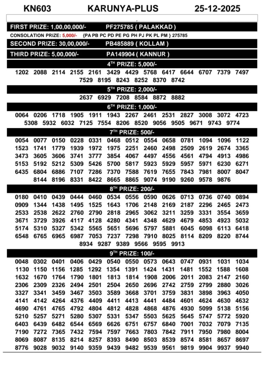 Kerala Lottery Result Chart KN-603 25.12.25